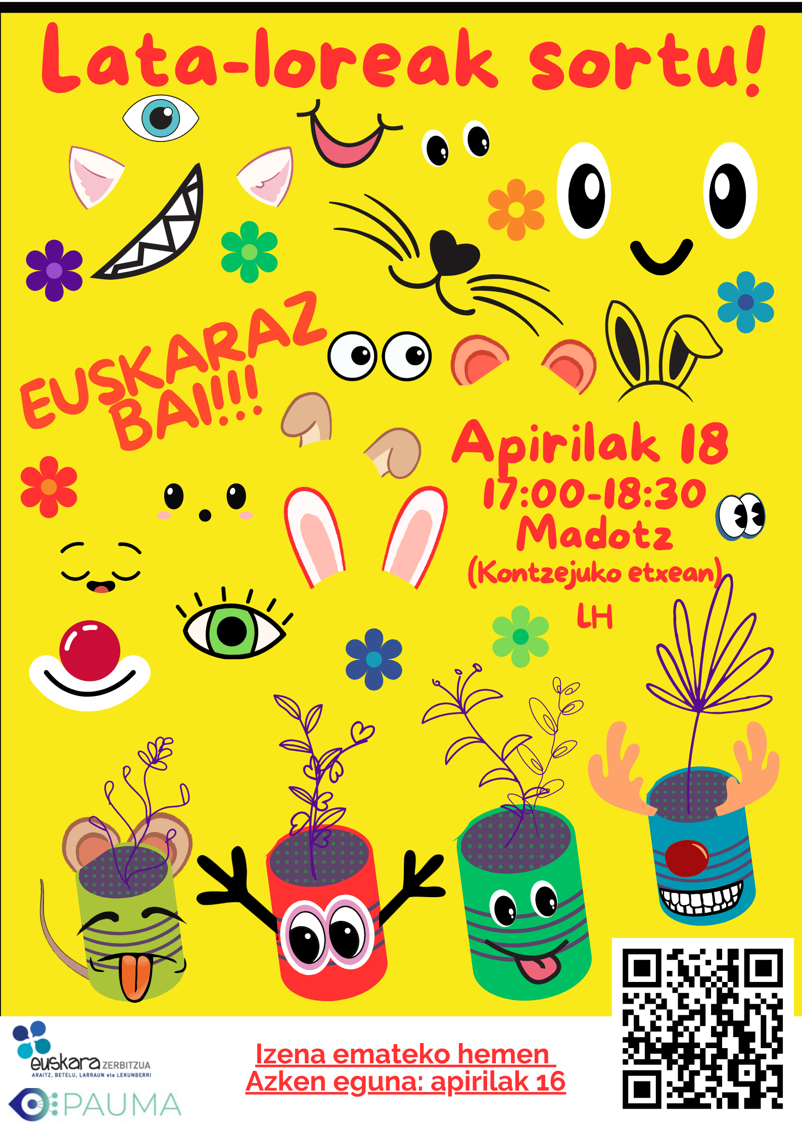 Haurrentzako lata-loreak sortzeko tailerra (LH). Izena eman behar da apirilaren 16a baino lehen QRan // Taller para hacer botes para flores para txikis (EP). Hay que inscribirse antes del 16 de abril en el QR