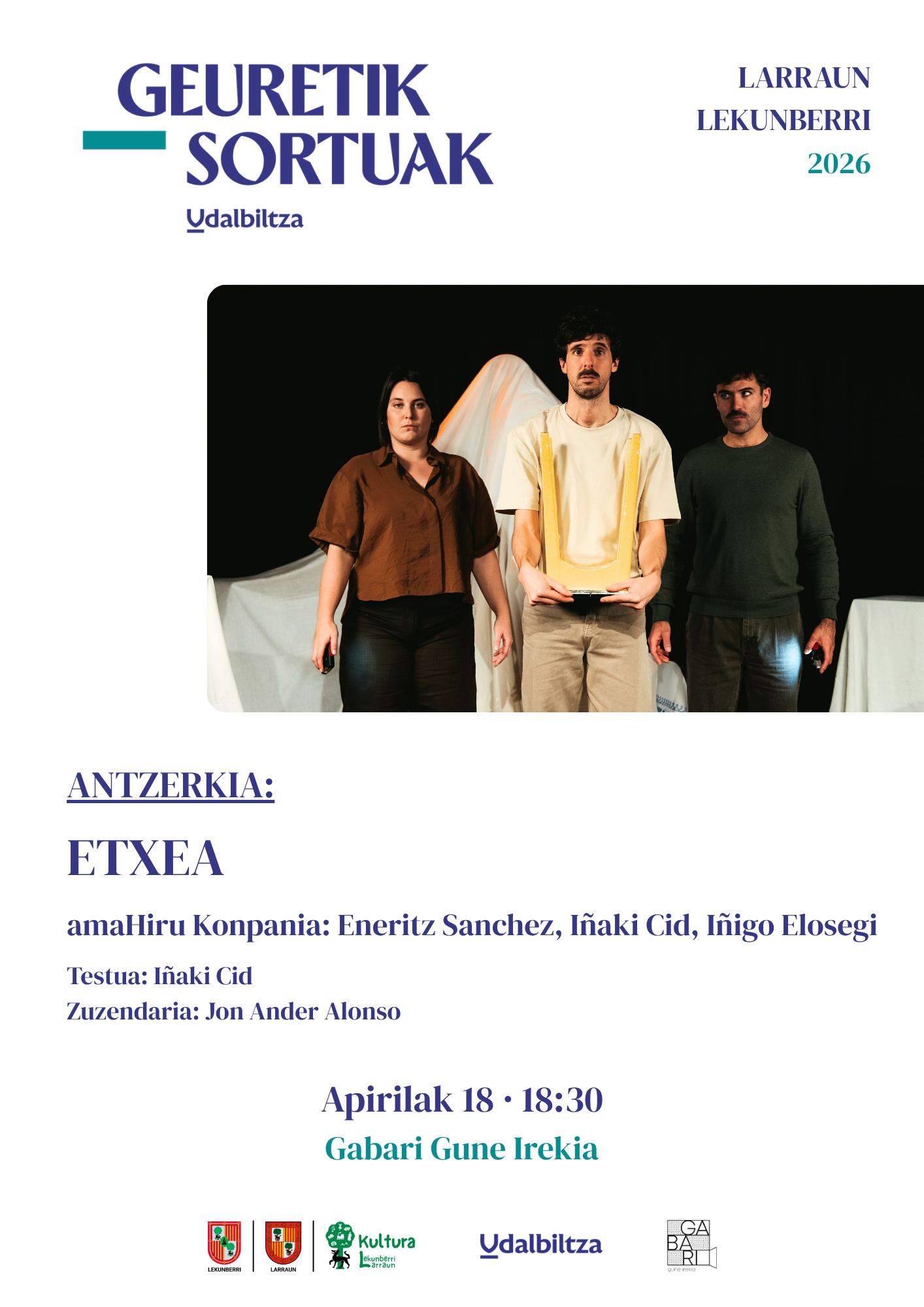 Geuretik Sortuak proiektua. Amahiru konpainiak horrela deskribatzen du Etxea lana: "Berrehun metro karratuko etxe baten aurrean aurkitzen gara. Sabai altuak, haritz egurrezko zoruak eta kaobazko ateak. Hemen ezkerretara egongela nagusia, lan prekarioaren ondoan eta aurrerago beste egongela txikiago bat inoiz lortuko ez dituzun ametsez betea. Sukaldea hor parean, bidean ahaztu zenituen lagunen jangelarekin konektatua. Bi komun, […]