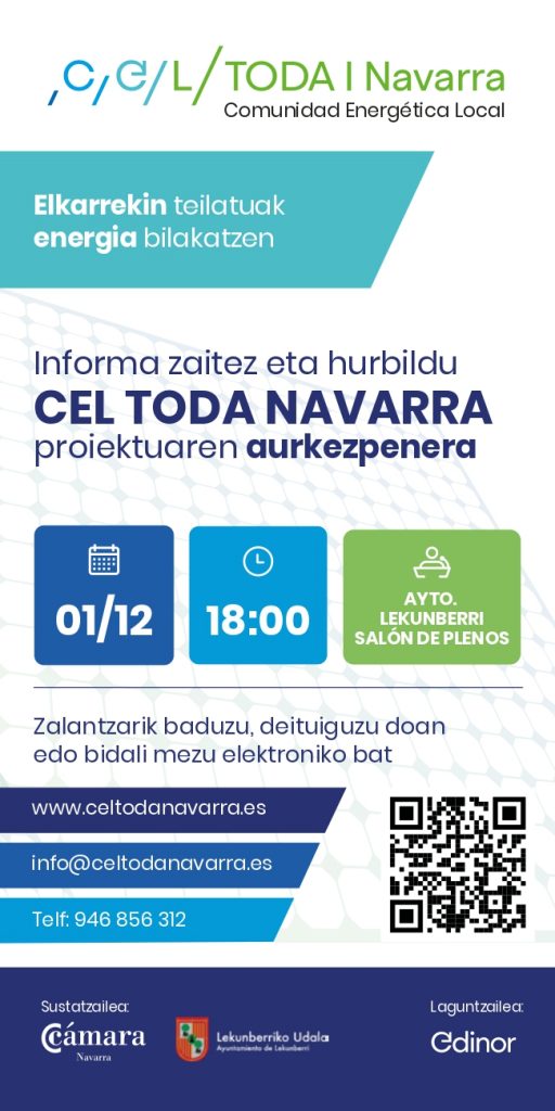 Udalari esker, Energia Komunitate batean -CEL Toda Navarra- parte har dezakezu. Komunitateak Km 0-ko energia berriztagarria sortuko du udal eraikinen teilatuen gainazaletan instalatutako plaka fotovoltaikoen bidez, eta hartaz gozatuko duzu […]