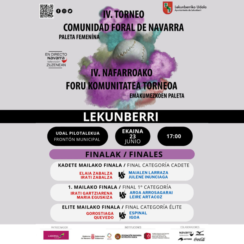 IV. Nafarroako Foru Komunitatea Torneoa emakumezkoen paletan ekainaren 23an ospatuko da, 17:00etan Udal Pilotalekuan Bi Larraundarrak iritsi dira finalera: Irati Gartziarena eta Maria Eguskiza. Segi animatzera!