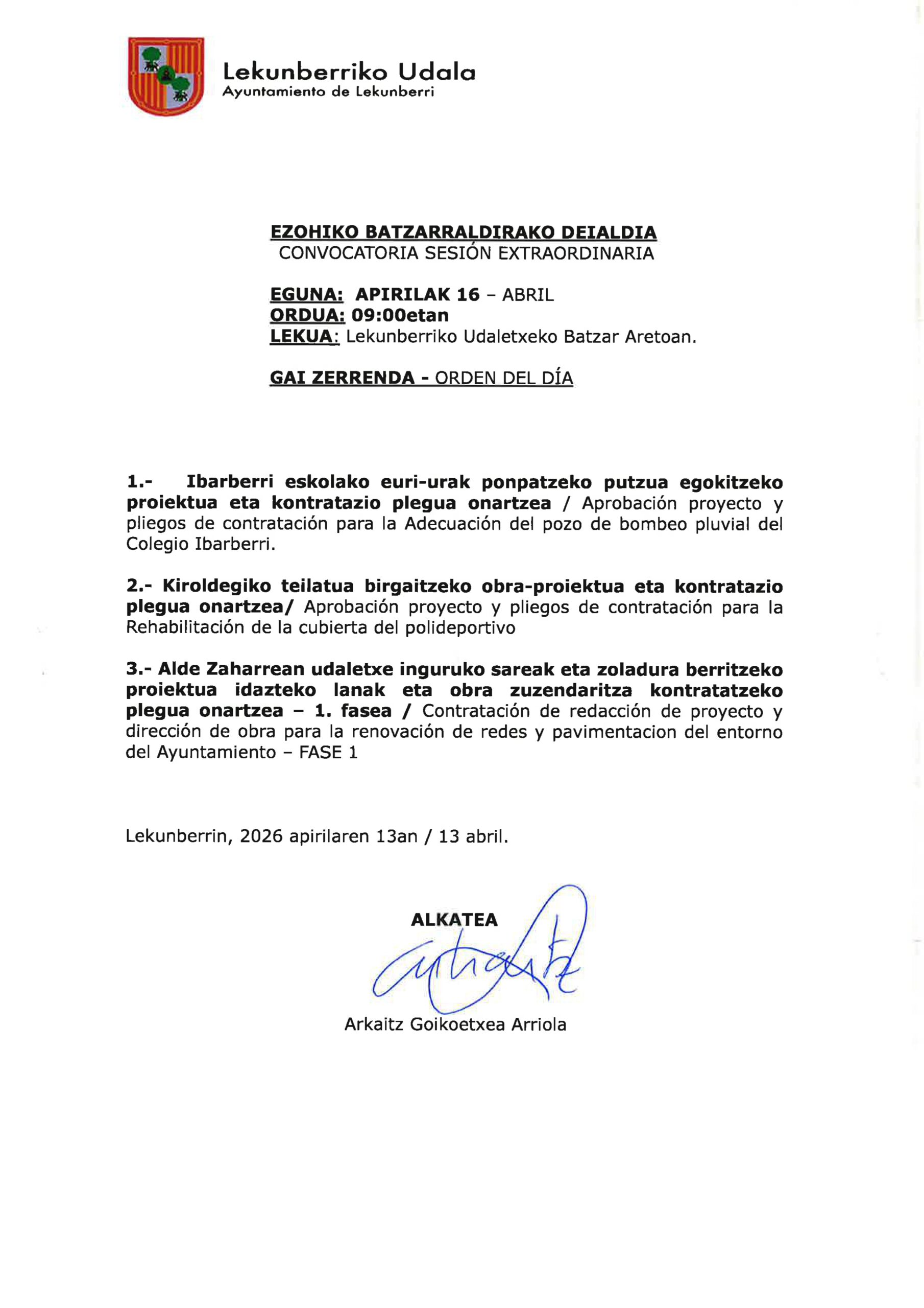 Lekunberriko Udalak apirilaren 16an, ostegunean, goizeko 9:00etan, Ezohiko Batzarraldia egingo du. Bertan, udalerriarentzat garrantzitsuak diren hainbat puntu onartu beharko dira: