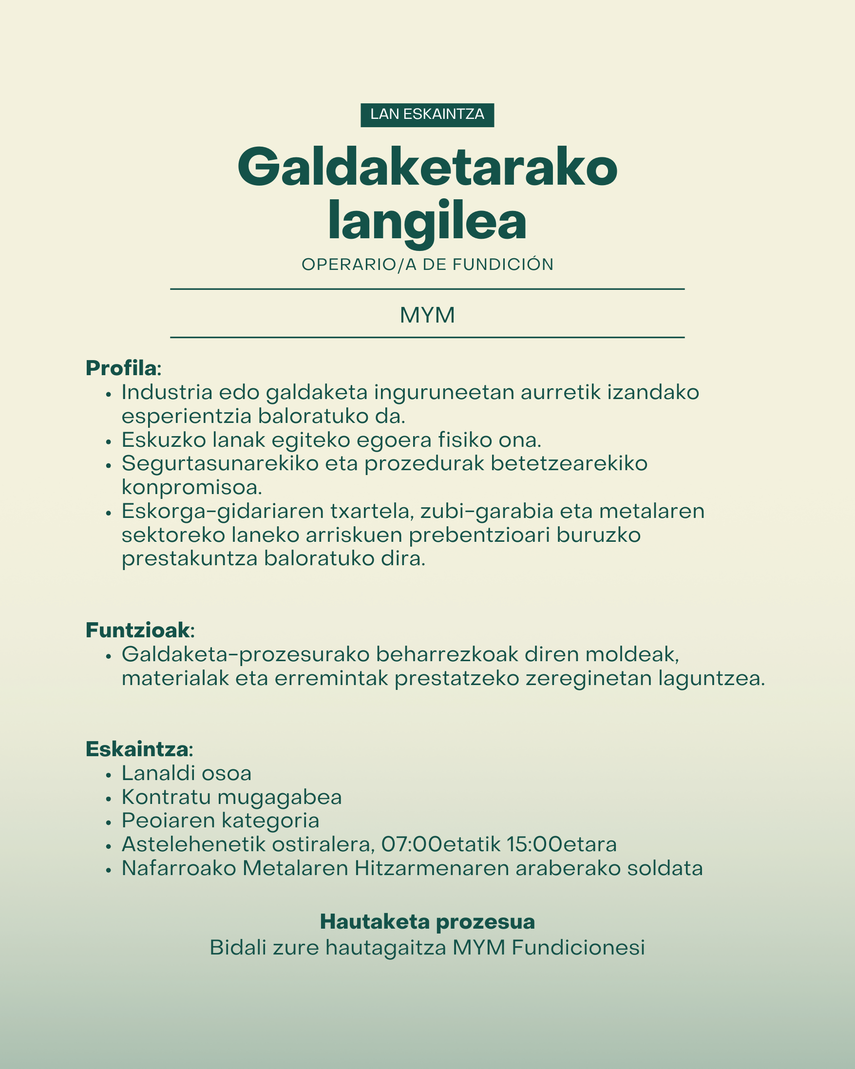 MYM Fundiciones enpresak Lekunberriko lantegian galdaketako langile bat sartzeko lan eskaintza argitaratu du.